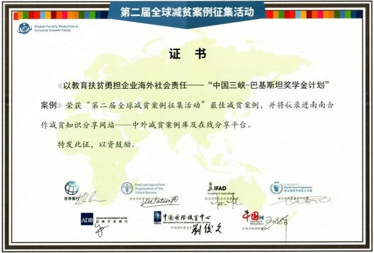 2022年,三峡南亚公司“中国三峡-巴基斯坦奖学金计划”作为首个中资企业在巴设立的全额移民奖学金项目,成功入选第二届全球最佳减贫案例,并被收录进南南合作减贫知识分享网站——中外减贫案例库及在线分享平台。该计划已选拔资助两批次共33名优秀学生在中巴两国学习交流并顺利完成学业,得到了两地教育主管部门、校方的高度肯定,先后有13名毕业生在卡洛特水电站从事专业技术工作。通过捐资助学,三峡集团为项目所在地的青年创造了更加光明的未来,同时也为当地储备了技术人才,搭建了中巴友谊桥梁。