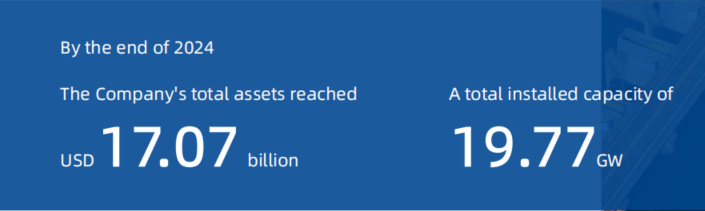 By the end of 2024, the Company's total assets reached USD 17.07 billion, with a total installed capacity of 19.77 GW (consisting of controllable capacity1 and capacity with equity interest2 ). The Company has 90 controllable power stations worldwide, including 15 hydropower stations, 29 wind farms, and 46 PV power stations. The Company has received national sovereign ratings from international credit rating agencies including Moody's, S&P, and Fitch, ranging A1, A and A+ respectively from 2022 to 2024.