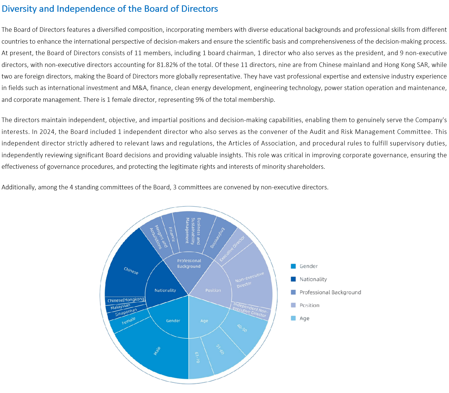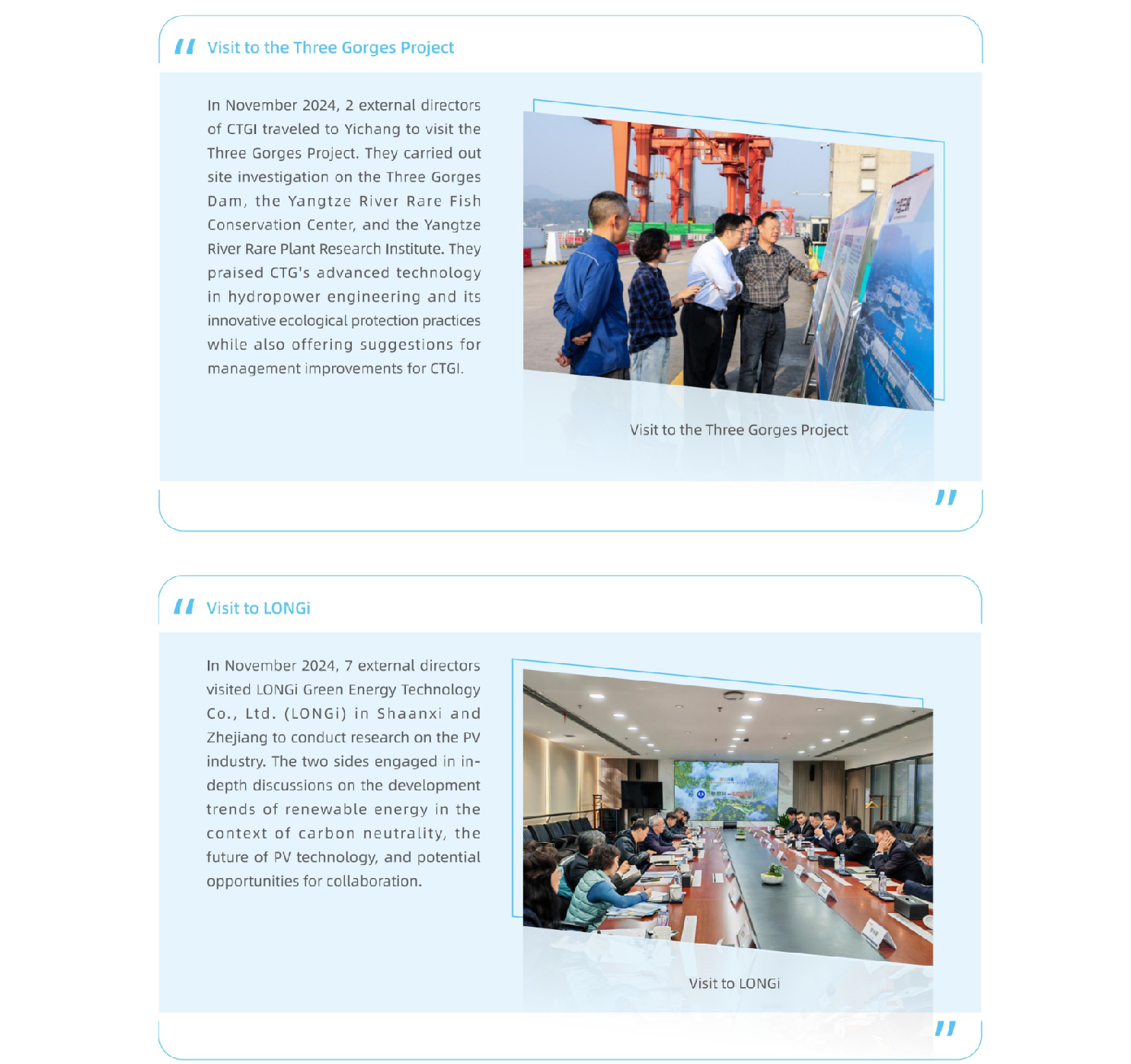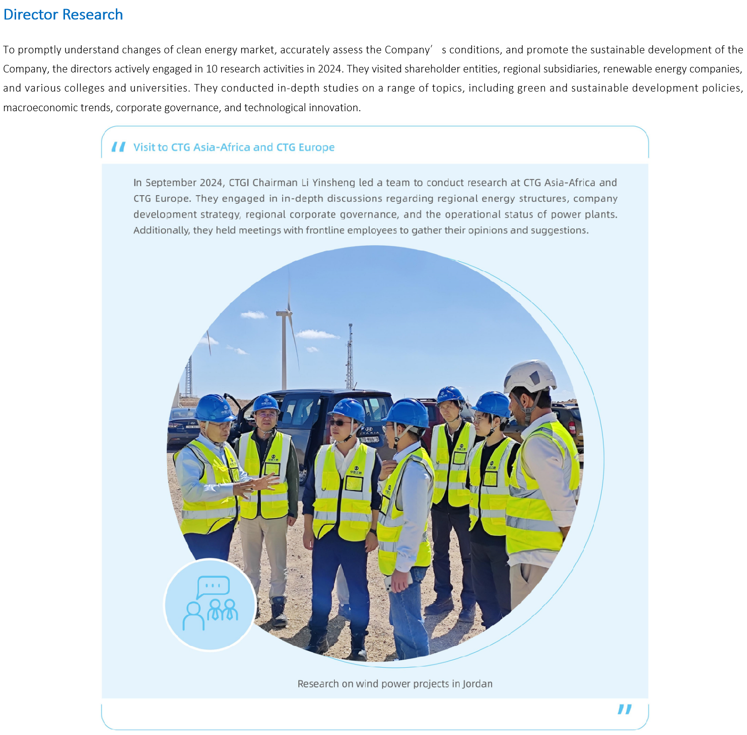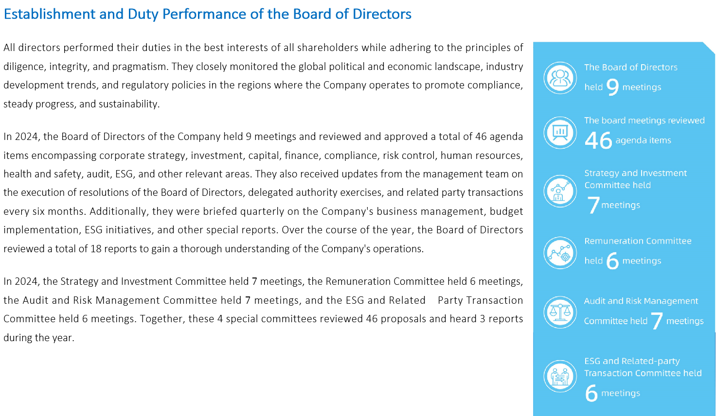 The Board of Directors plays a pivotal role in CTGI's corporate governance by "setting strategies, making decisions, and preventing risks". The Board of Directors is responsible for implementing various resolutions approved at the General Meeting of Shareholders, overseeing and managing the Company's management team and daily operations on behalf of shareholders, ensuring compliance, standardized operations, sustainable, healthy, and stable development of the Company, and protecting the legitimate rights and interests of the Company and its shareholders. The Board of Directors consists of 4 standing committees, including the Strategy and Investment Committee, Remuneration Committee, the Audit and Risk Management Committee, and the ESG and Related-party Transaction Committee. These standing committees have well-defined boundaries and specific functions to assist the Board of Directors in making informed decisions, ensuring the scientific rigor and accuracy of its decision-making processes.