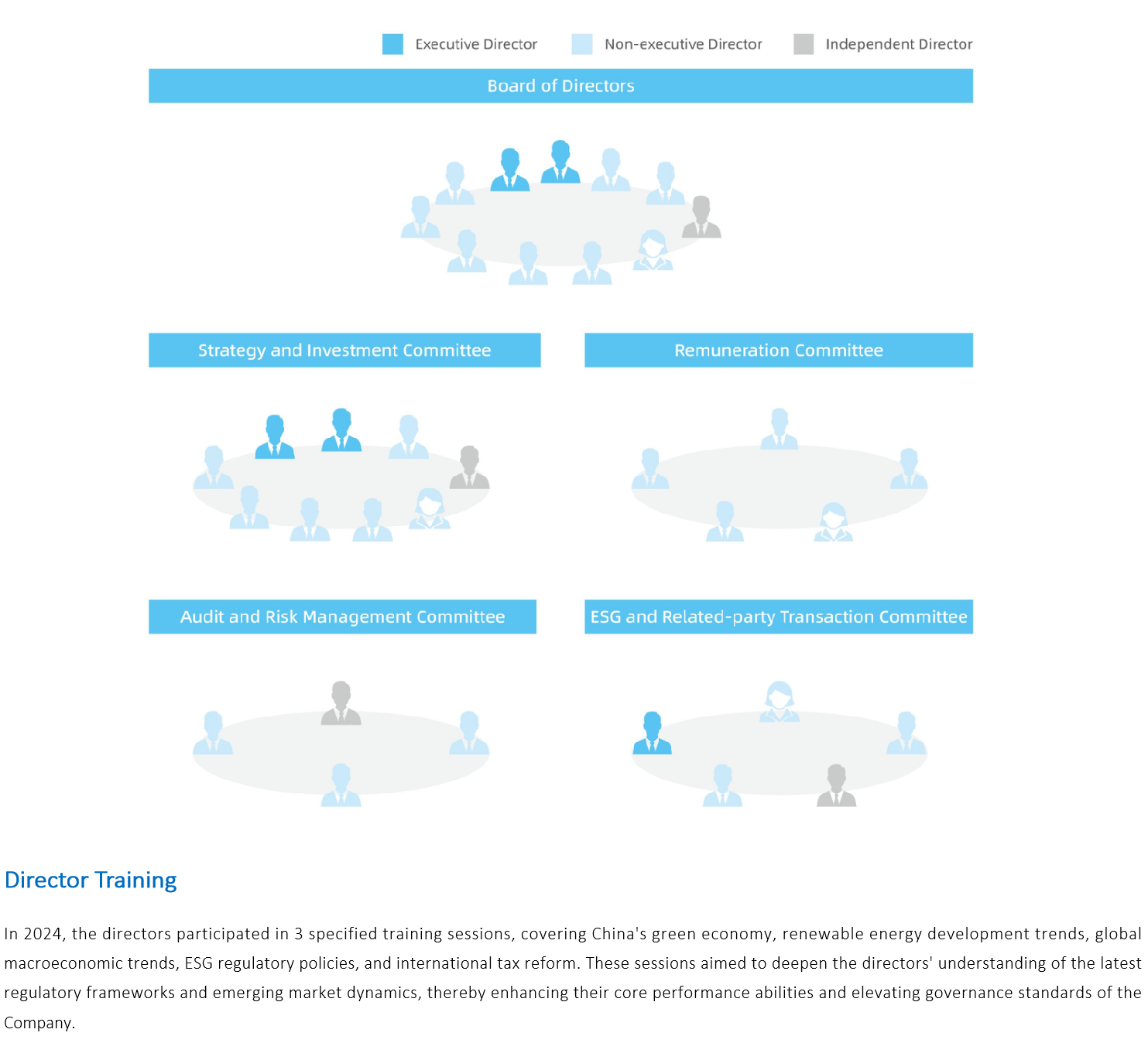 The ESG and Related-party Transaction Committee is primarily responsible for deliberating the Company's sustainable development issues, examining the establishment, processes, and systems of the Company's ESG framework, reviewing the Company's ESG vision, strategy, objectives, and social responsibility project plans, evaluating the operation of the Company's ESG framework, identifying pertinent risks and opportunities, and providing recommendations to the Board of Directors to ensure the sustainability of corporate governance. The committee is also responsible for formulating management policies concerning related party transactions of the Company, overseeing and reviewing such transactions to ensure compliance with relevant laws, regulations, and the Company's internal policies, ensuring the compliance of these transactions. Furthermore, the committee regularly receives updates on the Company's information disclosure and engagement with stakeholders, supervising and guiding these efforts to enhance the transparency of the Company.