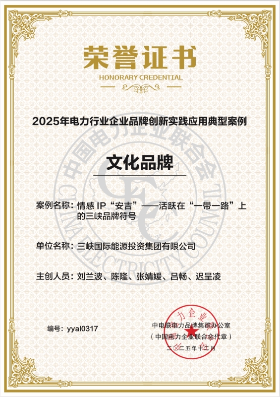 12月19日,在中国电力企业联合会组织的“2025年电力行业企业品牌创新实践应用典型案例”征选活动中,三峡国际报送的《情感IP“安吉”——活跃在“一带一路”上的三峡品牌符号》案例,从众多参选作品中脱颖而出,荣获“文化品牌”类典型案例。该案例生动展示了公司如何创造性打造“安吉”(Engr)这一拟人化品牌IP,通过系列线上线下策划,将其融入海外业务拓展、环保理念倡导、社会责任履行及文化交流活动中,有效提升了品牌温度与亲和力,成为连接中外员工与公众的情感纽带和文化桥梁。