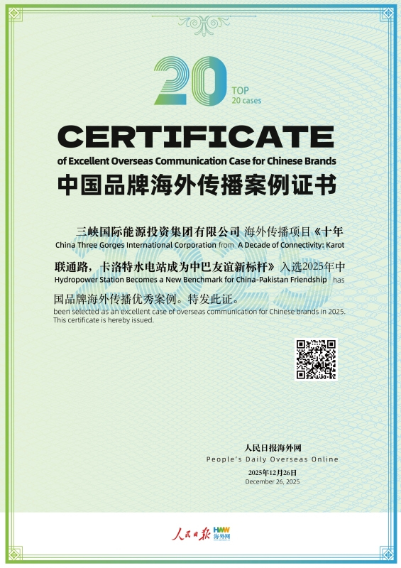 12月26日,由人民日报海外网主办的“2025中国品牌海外传播优秀案例”评选结果揭晓,三峡国际申报的《十年联通路,卡洛特水电站成为中巴友谊新标杆》案例成功入选。该案例系统阐述了卡洛特水电站作为“一带一路”旗舰项目,在建设运营过程中,如何通过聚焦“高质量、可持续、惠民生、跨文化”四大维度,深化“硬联通”、推动“软联通”、促进“心相通”,成功塑造了可信、可爱、可敬的中国企业形象,为中国品牌海外传播提供了可验证、可参考、可推广的实践路径。