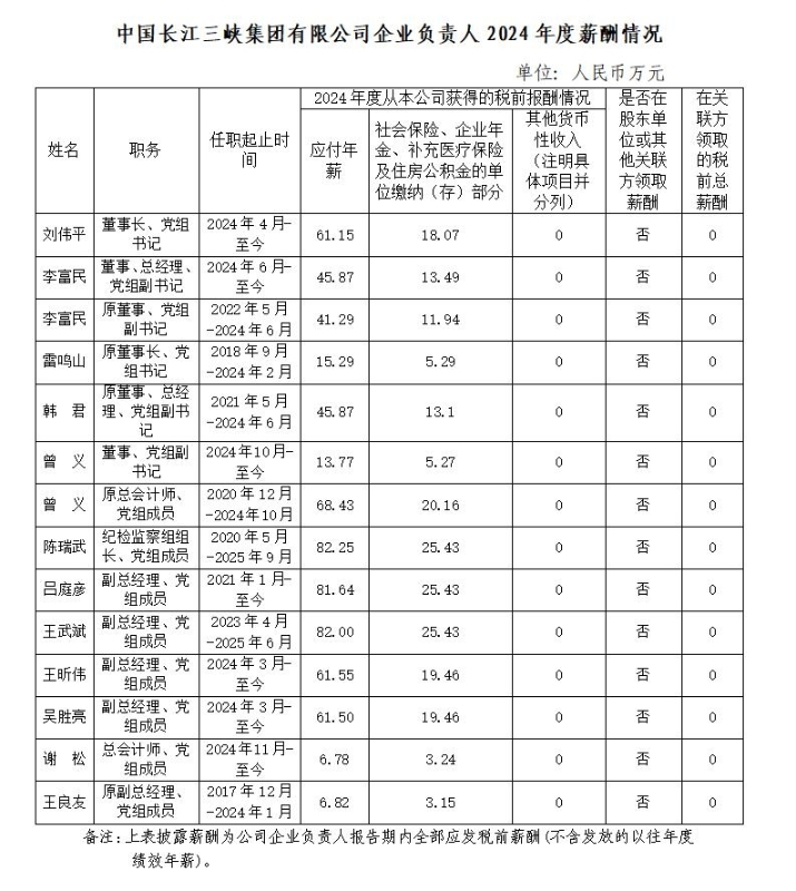 中国长江三峡集团有限公司企业负责人2024年度薪酬情况